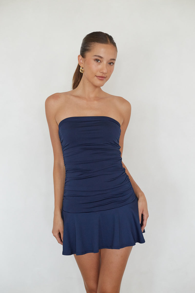 Slip into something sexy with the Alora Strapless Ruched Mini Dress. This must-have features a simple strapless neckline, flattering bodycon silhouette, and flirty flare ruffle hem. Available in White, Black, and Red; style with a pair of to complete the look!