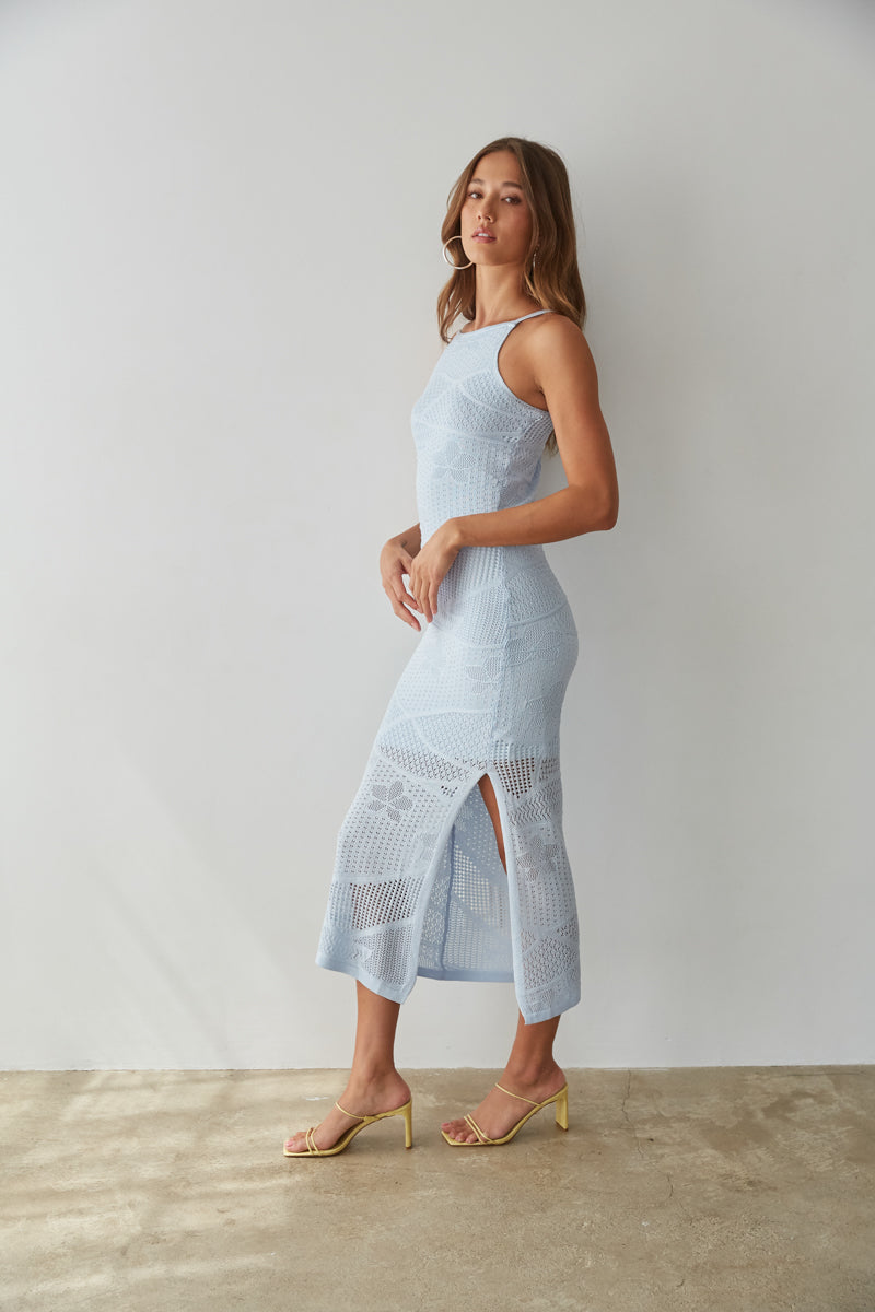 Get vacation ready in the Keilani High Neck Open Knit Midi Dress! This gorgeous dress features an open knit design, high neckline, and side slit. Available in blue and peach. Pair with a simple to complete this chic look!