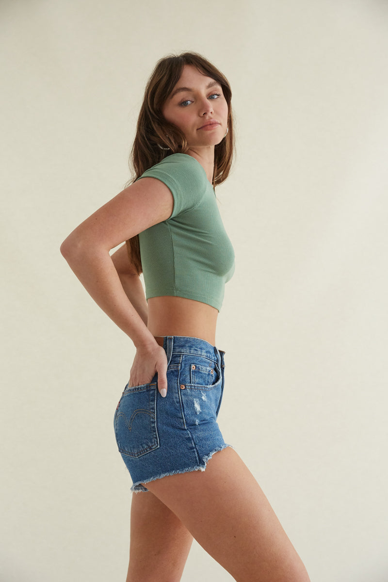 Put the Nessa Ribbed Baby Tee at the top of your must-haves list! This essential cropped t-shirt features a stretchy ribbed material and crew neck. Available in grey, black, green, and white. Pair with you favorite for a classic everyday look!