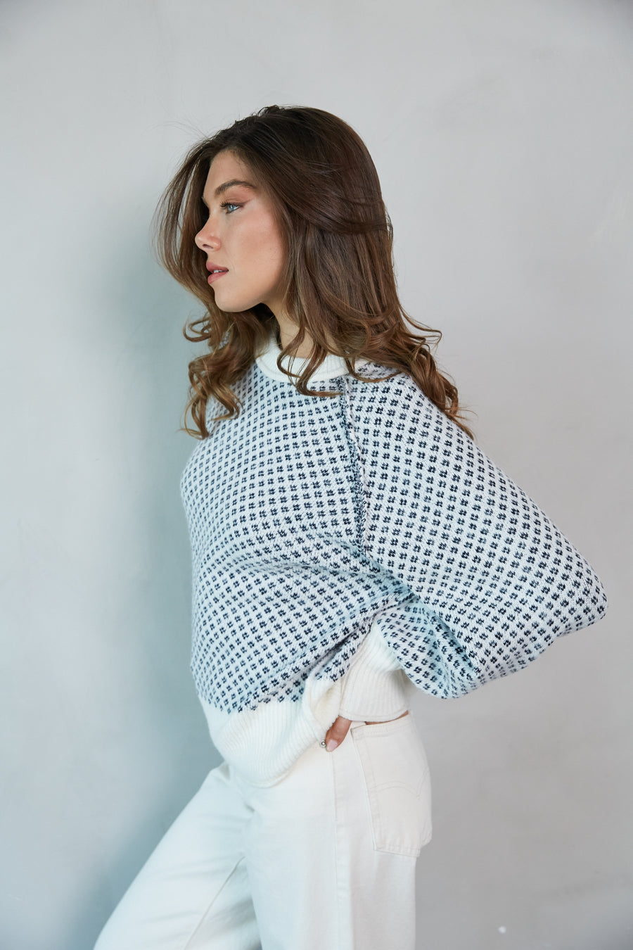 Stay beyond cozy in the Ramona Ditsy Argyle Sweater. This quirky sweater features a ditsy argyle pattern, ribbed trim, and oversized fit. Available in Navy + White; style with your favorite to complete the look!