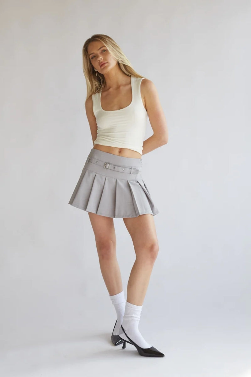 Live out your Y2K dreams in the Sloan Woven Pleated Mini Skirt! This trendy skirt is made of a woven fabric and features a low-rise waist, pleated hem, belt loops, and a thin removable belt with silver grommets. Pair with the to complete the look!